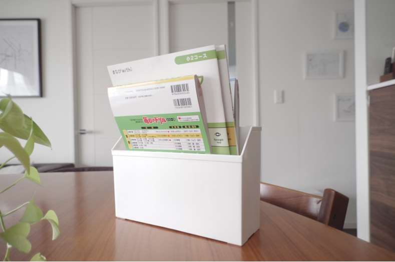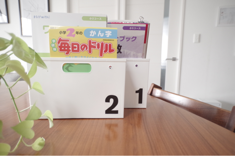 でも、「勉強道具は自分の机に片付けてよね!」と思うからこの状態にイライラするんだなということで、もう観念してダイニング内に勉強道具を置くことにしました(え?今さら?)。