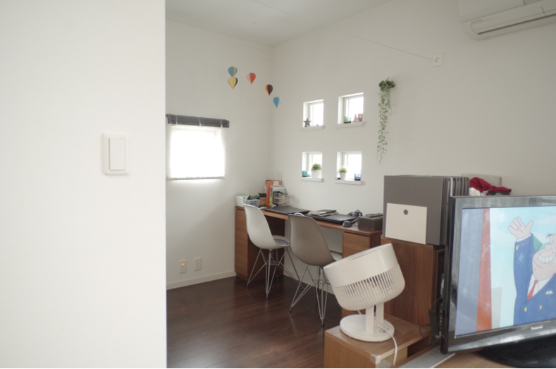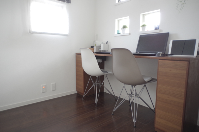 LDK内にあるんだけど奥まっていてちょっとだけ独立しているという、この我が家のワークスペースの配置。