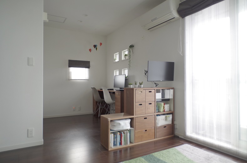 無印良品のスタッキングシェルフでワークスペース側とリビング側をゆるく区切っていますが。