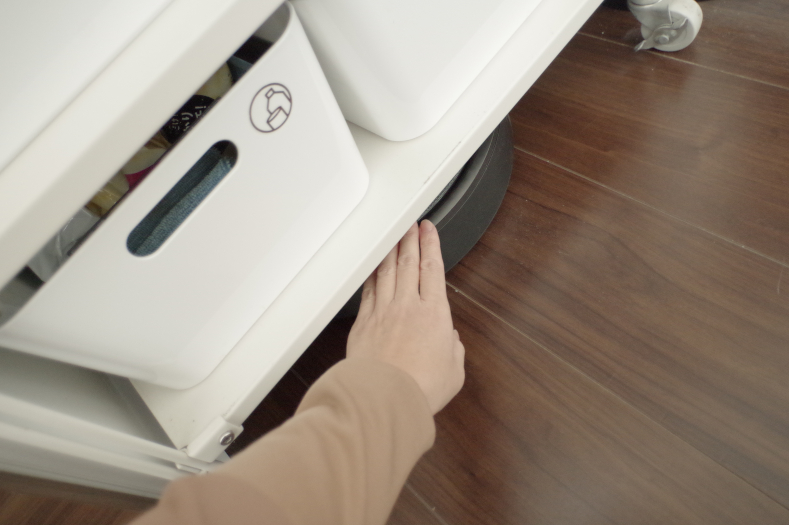 なので、今まではルンバ本体が10センチくらい手前にはみ出すような位置にホームベースを置いていました。でもアプリがあれば、物理的にスイッチ押す必要がないので、目立たないようにグーっと奥に押し込める♪