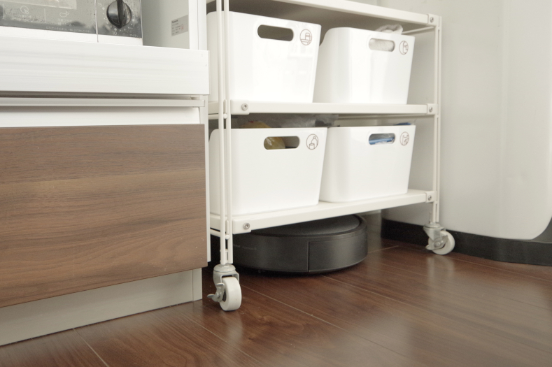 我が家のルンバステーションは、キッチンに置いたスチールユニットシェルフの下なんですが。